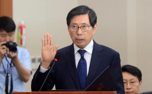박상기 법무부장관 후보자가 13일 오전 서울 여의도 국회 법제사법위원회 전체회의실에서 열린 인사청문회에서 선서하고 있다. 사진/뉴시스