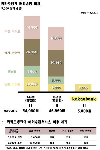 카카오뱅크는 5000달러 이하 송금시 총 비용은 5000원, 5000달러 초과시에는 1만원이다. 카카오뱅크는 전신료, 중개수수료, 수취수수료를 면제할 계획이다. 단, 일본, 태국, 필리핀은 금액에 관계없이 8000원이며 중개수수료와 수취수수료가 발생할 수 있다.