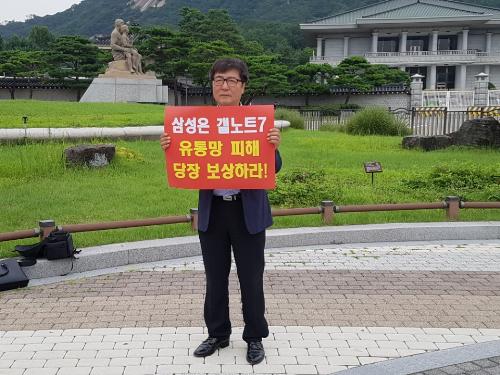 27일 서울 종로구 효자동 청와대 앞에서 노충관 전국이동통신유통협회 사무총장이 삼성전자의 갤럭시노트7 리콜사태에 따른 유통업계 피해보상 대책을 요구했다. 사진/뉴스토마토