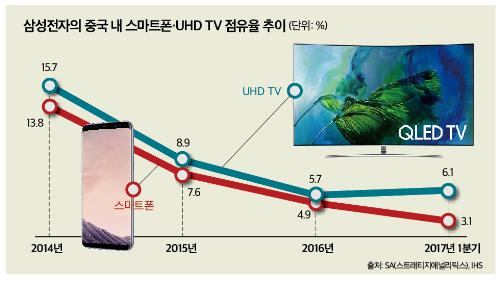 UHD TV 시장에서도 TCL·하이센스 등 현지 기업에 밀려 고전을 면치 못하고 있다. 삼성전자는 2014년 2분기 중국 UHD TV 시장에서 30%대 점유율로 중국 TV업체들을 압도했다. 하지만 시장조사기관 IHS에 의하면 UHD TV 점유율(수량기준)은 계속된 하향세로 2015년 8.9%, 2016년에는 5.7%까지 떨어지는 굴욕을 맛봤다. 올 1분기에는 6.1%(8위)로 소폭 상승했지만, 전체 TV 점유율은 3.9%(한국전자정보통신산업진흥회)로 10위에 그쳤다.