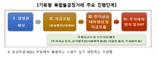 기획형 복합불공정거래의 주요 진행단계를 살펴보면 ▲투자조합·비외감법인 등이 상장법인 경영권 인수 ▲제3자배정 유상증자, 전환사채(CB)·신주인수권부사채(BW) 등 대규모 자금조달 ▲호재성 허위사실 유포 등 주가부양 ▲구주 매각을 통한 차익실현 등으로 패턴화된 유형을 나타냈다.