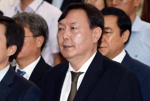 윤석열 서울중앙지검장이 지난달 19일 박상기 신임 법무부 장관 취임식에 참석해 애국가를 부르고 있다. 사진/뉴시스