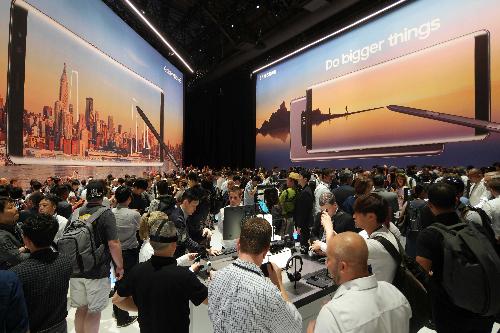23일(현지시각) 미국 뉴욕 파크 애비뉴 아모리(Park Avenue Armory)에서 열린 '삼성 갤럭시 언팩 2017'에서 참석자들이 '갤럭시 노트8'을 체험하고 있다. 사진/삼성전자