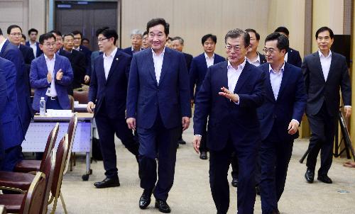 문재인 대통령이 25일 정부세종컨벤션센터 국제회의장에서 열린 기획재정부-공정거래위원회-금융위원회 핵심정책 토의에 입장하고 있다. 사진/뉴시스