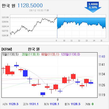 12일 서울 외환시장에서 원·달러 환율은 전 거래일보다 2.4원 내린 1129.5원에 거래를 시작해, 전 거래일보다 3.4원 하락한 1128.5원에 거래를 마쳤다.