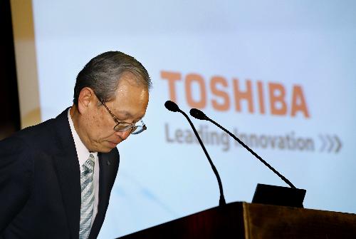 쓰나카와 사토시 도시바 사장이 기자회견을 앞두고 인사하고 있다. 사진/뉴시스