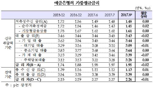 기업대출은 대기업(3.09%)과 중소기업(3.64%)로 7월에 비해 각각 1bp 하락, 보합을 나타냈다. 기업, 가계 모두를 포함한 대출금리는 가계대출 중심으로 하락하면서 7월에 비해 2bp 하락한 3.43%를 기록했다.
