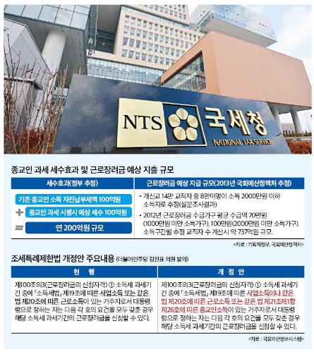 정부는 현재 종교인 23만명 중 80%에 해당하는 18~19만명이 근로소득세 면세점 이하의 소득을 올리고 있는 것으로 보고 있다. 문제는 현재 마련돼 있는 종교인 과세 체계 하에서 면세점 이하의 저소득 종교인이 근로장려금 지원대상에 포함될 가능성이 높다는 것이다.