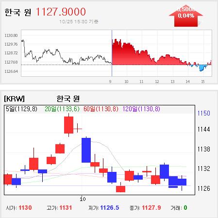 25일 서울외환시장에서 원·달러 환율은 전 거래일보다 2.6원 오른 1130.0원에 거래를 시작해, 전 거래일보다 0.5원 오른 1127.9원에 거래를 마쳤다.