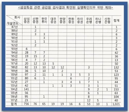 박 의원은 “기간별로 보면 2004년부터는 전적으로 삼성증권에만 차명주식 은닉이 집중됐다”며 “특히 2004년의 경우 삼성증권의 차명계좌 개설 실적이 141개에 달했다"고 지적했다.