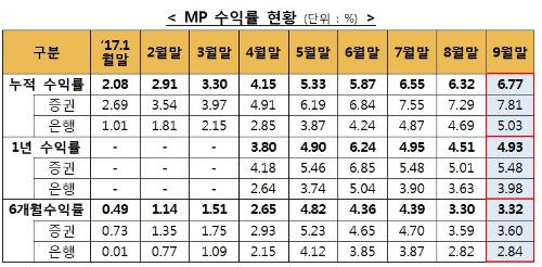 25개사 203개 MP 모두 플러스(+) 수익률을 기록한 가운데 약 60%(121개)의 MP는 5% 초과 수익률을 달성했다. 특히 전체 19%를 차지하는 39개 MP는 10%를 초과하는 수익률을 기록했다.