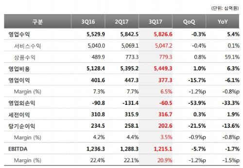 이는 마케팅비용과 방송발전기금 등 비용 전반의 증가 때문으로 분석된다. 1년에 한 번 정부에 내는 방송발전기금은 240억원이다. 마케팅비용은 6777억원으로 지난해 같은 기간보다 2% 올랐다. 같은 기간 영업비용도 5조4493억원으로 6.3% 올랐다. 특히 판매관리비와 상품구입비가 크게 늘었다. 하반기 출시된 갤럭시노트8, LG V30등 프리미엄 단말기에 대한 구입이 늘어난 영향으로 보인다.
