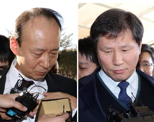 ‘국정원 특수활동비 청와대 상납 의혹’ 관련 긴급체포된 이재만(왼쪽) 전 청와대총무비서관과 안봉근 전 청와대 제2부속비서관이 지난 31일 오전 서울 서초구 서울중앙지검에 들어서고 있다. 사진/뉴시스
