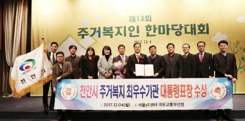 4일 오후 서울 양재동 aT센터에서 열린 '2017 주거복지인한마당 대회'에서 대통령 표창을 수상한 충남 천안시가 기념촬영을 하는 모습.사진/뉴시스