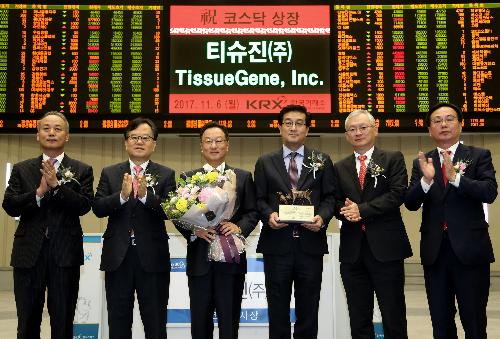 11월6일 한국거래소 코스닥시장본부는 서울 여의도 한국거래소 서울사옥 홍보관에서 퇴행성관절염 치료제(인보사) 개발기업인 티슈진의 코스닥시장 신규상장 기념식을 열었다. 사진/뉴시스