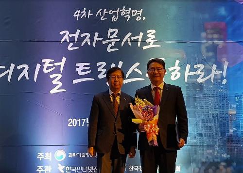 삼성동 코엑스에서 열린 ‘2017 전자문서 대상’에서 과학기술정보통신부장관상을 수상 후 신한은행 양진규 스마트혁신본부장(오른쪽)과 김석환 한국인터넷진흥원장(왼쪽)이 기념촬영하고 있다. 사진/신한은행