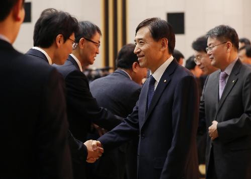 이주열 한국은행 총재가 2일 오전 서울 중구 부영태평빌딩에서 열린 시무식을 마치고 참석자들과 신년인사를 하고 있다. 사진/뉴시스