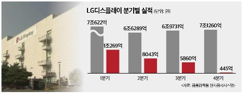LG디스플레이는 23일 연결기준으로 지난해 4분기 매출액 7조1260억원, 영업이익 445억원을 기록했다고 공시했다. 전년 동기 대비 매출은 10%, 영업이익은 95% 급감했다. 사상 최대 분기 이익을 냈던 지난해 1분기(1조269억원)와 비교하면 25분의 1 수준이다. 시장 예상치(영업익 3188억원)를 크게 밑돌면서 어닝쇼크 수준의 성적표를 내놨다.