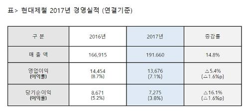 현대제철 2017년 연결기준 경영실적. 표/현대제철