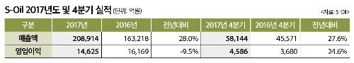 S-Oil은 29일 2017년도 연결기준 매출액 20조8913억7400만원, 영업이익 1조4625억1800만원을 기록했다고 공시했다. 전년 대비 매출은 28.0% 늘었으나 영업이익은 9.5% 줄었다. 같은 기간 당기순이익은 8.8% 증가한 1조3111억9800만원으로 집계됐다. S-Oil은 "지난해 고유가에 따른 정제마진 상승에도 불구, 환율하락 영향으로 연간 영업이익은 다소 줄었다"며 "당기순이익은 사상 최대"라고 말했다.