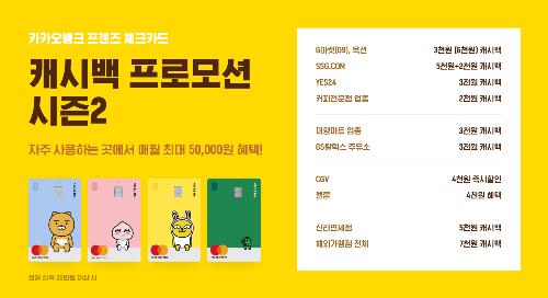 [뉴스토마토 문지훈 기자] 한국카카오은행(카카오뱅크)은 다음달 1일부터 '카카오뱅크 프렌즈 체크카드' 캐시백 프로모션 시즌2를 시작한다고 31일 밝혔다.