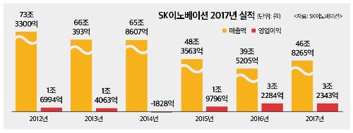 SK이노베이션은 31일 2017년도 연결기준 매출액 46조8265억4300만원, 영업이익 3조2343억3700만원을 기록했다고 공시했다. 전년 대비 매출액은 18.5%, 영업이익은 0.2% 올랐다. SK이노베이션은 "지난해 영업이익은 2016년 실적을 소폭 넘었다"며 "원유도입선 다변화와 공장운영 최적화를 통해 석유사업의 본원적 경쟁력이 강화됐다”고 말했다.