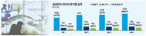 슈퍼사이클에 진입한 반도체가 전체 실적을 견인했다. 반도체 부문은 전체 연간 영업이익 가운데 65.6%가량인 35조2000억원을 벌어들였다. 회사 관계자는 "낸드의 경우 지난해 7월 본격 가동에 들어간 평택 반도체 라인에서 64단 3D(3차원) V낸드를 안정적으로 공급해 실적이 견조했으며, D램은 1X나노 제품 공급 확대를 바탕으로 고용량 서버 D램, LPDDR4x 등 차별화된 제품으로 시장에 적극적으로 대응해 실적 개선을 지속했다"고 설명했다. 여기에 디스플레이 패널 사업도 가세했다. 애플의 아이폰X에 플렉시블 OLED 패널이 채용되면서 사실상 세계 시장에서 이를 독점하는 삼성디스플레이가 수혜를 봤다. 디스플레이까지 합친 부품(DS)부문의 영업이익은 40조6000억원으로 지난해 전체 영업이익 가운데 74.7%를 차지한다.
