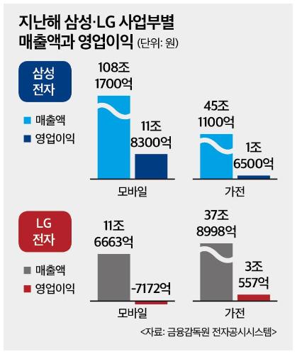 [뉴스토마토 왕해나 기자] 삼성전자와 LG전자가 지난해 기록적인 실적을 낸 가운데, 사업부별로는 희비가 갈렸다. 삼성전자는 휴대폰사업이 지난해 3년 이래 최대 실적을 거둔 반면, 가전부문의 수익성은 하락했다. LG전자는 가전사업의 활약으로 역대 최대 매출을 기록했지만, 모바일부문은 부진을 끊지 못했다.
