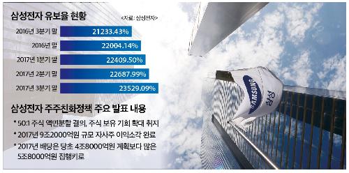 삼성전자는 31일 지난해 연간실적과 함께 재무상태를 공개했다. 지난해 말 기준 자본에서 자본금을 뺀 잉여금은 213조5939억원으로 나타났다. 전년 말 192조655억원보다 11.2% 오른 수치다. 유보금을 납입자본금으로 나눈 자본유보율은 2016년말 2만2004.14%에서 2017년 들어 1분기말 2만2409.5%, 2분기말 2만2687.99%, 3분기말 2만3529.09%로 꾸준히 증가세를 보였다. 그 사이 삼성전자는 잉여금으로 자사주를 사들여 즉시 소각하는 대규모 이익소각을 단행했고, 배당도 분기마다 집행하며 지출을 늘렸지만 자본과잉 상태는 풀리지 않았다.