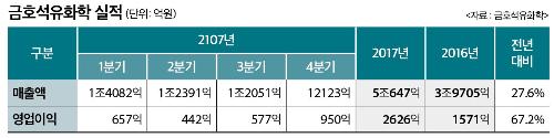 금호석유화학이 매출 5조원을 달성한 것은 지난 2013년(5조1321억원) 이후 4년 만이다. 영업이익이 2000억원을 넘은 것은 2012년(2238억원) 이후 5년 만이다.