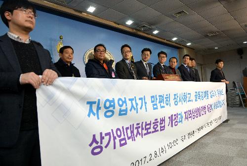 지난해 2월8일 오전 서울 여의도 국회 정론관에서 자영업자들이 상가임대차보호법 개정과 지역상생발전법 제정 관련 기자회견을 하고 있다. 사진/뉴시스