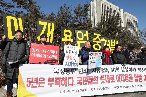 이재용 삼성전자 부회장의 항소심 선고일인 5일 오후 서울 서초구 서울고등법원 앞에서 열린 '국정농단 단죄, 사법정의실현, 삼성적폐 청산, 이재용 부회장 엄중처벌 촉구' 기자회견에서 고 황유미 씨의 아버지 황상기(왼쪽 네번째) 씨가 이 부회장의 엄중처벌을 촉구하고 있다. 사진/뉴시스