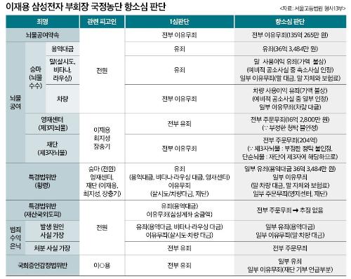 단순뇌물 인정액도 73억원에서 36억원으로 줄었다. 1심은 이 부회장 등이 대통령의 승마지원 요구를 정씨 개인에 대한 승마 지원 요구라는 점을 알고 용역대금과 마필을 최씨가 지배하는 코어스포츠에 귀속시킨 점 등을 종합해 대가 관계를 인정했다. 항소심 재판부는 최씨 딸 정유라씨에 대한 승마 지원은 1심과 마찬가지로 뇌물로 인정하면서도 코어스포츠에 건넨 용역대금 36억원 상당과 마필과 차량을 무상으로 이용하게 한 '사용 이익'만을 뇌물로 봤다. 재판부는 이 과정에서 박 전 대통령과 최씨의 공모관계를 인정했다. 최씨가 승마지원을 능동적으로 주도하고 지원과정을 실질적으로 지배해온 점 등 최씨의 지위와 역할, 박 전 대통령의 지원 사정을 종합했을 때 공동의사행위 지배에 따른 뇌물수수의 공동정범이라는 판단이다. 뇌물 인정액이 줄어 횡령 인정액도 감소했다. 항소심 재판부는 국회증언감정법 위반죄에 대해 모두 유죄로 판단한 1심 재판부와 달리 이 부회장의 답변이 허위의 진술이라고 단정하기 어렵다며 일부 유죄로 봤다.