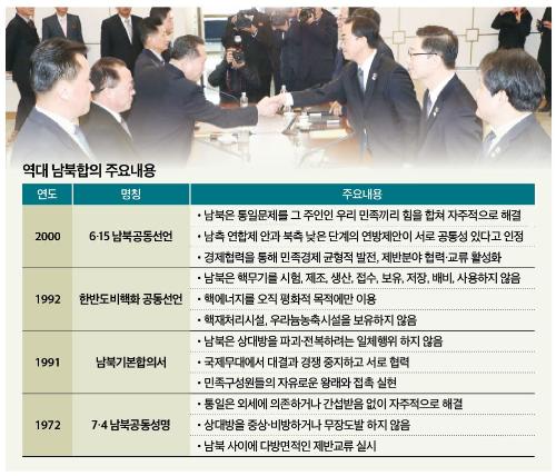 소련 등 동구권이 붕괴하며 냉전체제 해체가 가속화 한 1990년대 들어서 남북대화는 활발히 추진됐다. 남북은 각각의 총리를 수석대표로 하는 고위급회담을 개최해 전반적인 남북관계 발전문제를 협의했으며 그 결과 1991년 12월 ‘남북사이의 화해와 불가침 및 교류협력에 관한 협의서’(남북기본합의서)를 채택했다. 총 4장·25조에 걸쳐 광범위하게 남북관계 발전방향을 규정한 남북기본합의서에는 ▲서로 상대방의 체제를 인정·존중 ▲상대방 내부문제에 간섭하지 아니함 ▲국제무대에서 대결과 경쟁을 중지하고 서로 협력 ▲민족경제의 통일적·균형적인 발전과 민족 전체의 복리향상을 도모하기 위해 자원의 공동개발, 물자교류, 합작투자 실시 ▲과학·기술, 문화·예술, 보건, 체육 등에서 교류협력 실시와 같은 정치·경제·사회분야를 아우르는 내용이 담겼다.