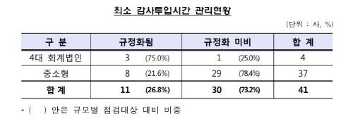 19일 금융감독원은 지난해 말 41개 회계법인을 대상으로 감사시간 관리실태를 조사한 결과 이같이 나타났다고 밝혔다. 담당이사·품질관리책임자의 최소 감사시간을 규정화한 회계법인은 11곳(27%)에 불과했으며 나머지 30곳(73%)은 최소한의 감사시간을 별도로 정하지 않고 있었다.
