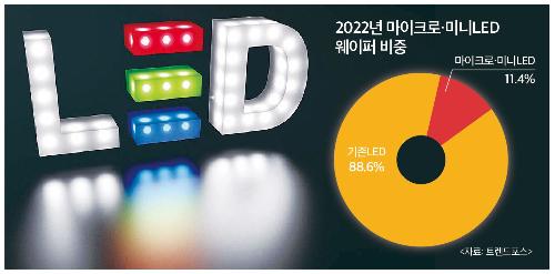 26일 시장조사기관 트렌드포스에 따르면 2022년 마이크로LED와 미니LED가 전 세계 LED 웨이퍼 생산량의 11.4%를 차지할 것으로 예상했다. 웨이퍼는 LED 칩 생산의 원재료다. 현재 마이크로LED와 미니LED가 연구개발 단계이며, 상용화 제품이 나오지 않았다는 점을 감안할 때 괄목할 성장 속도다.