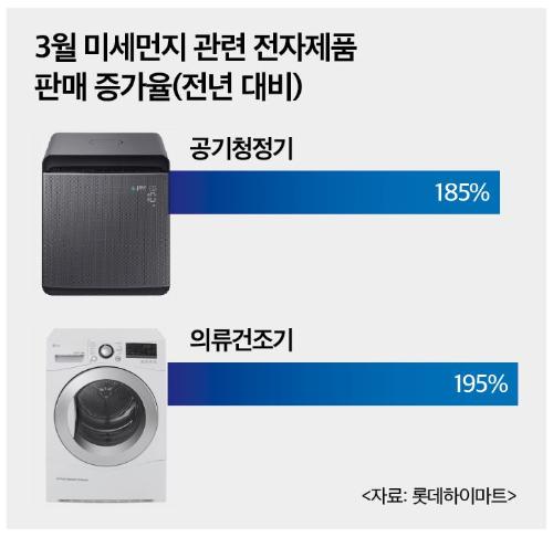 28일 전자제품 양판점에 따르면 미세먼지 영향으로 공기청정기와 건조기 판매량은 고공행진하고 있다. 롯데하이마트에 따르면 이달 들어(1일~27일) 판매된 공기청정기와 건조기의 판매 매출액은 지난해 같은 기간(2017년 3월1일~27일)보다 각각 185%, 195% 늘었다. 전자랜드는 지난 3개월간(1월1일~3월25일) 공기청정기 판매량은 지난해 같은 기간 대비 144% 성장했고, 올해 들어 건조기와 스타일러 등 의류관리기 판매량은 지난해 동기 대비 400% 성장했다.