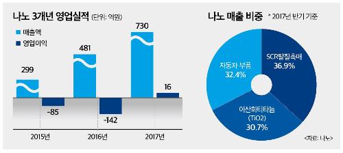 미세먼지 이슈가 대두되면서 나노는 발전소측 수요가 크게 늘었다. 2015년 연간 매출 299억원에서 2016년에는 481억원으로 200억원 가까이 증가했고, 지난해에는 730억원의 매출을 기록하며 영업이익도 흑자전환에 성공했다. 김 상무는 "2016년 6월부터 미세먼지 이슈가 커지면서 탈질촉매 물량 수요가 두 배로 증가했고 지금도 계속해서 늘고 있어 올해는 지난해 이상의 매출 성과를 거둘 것"이라고 전망했다.