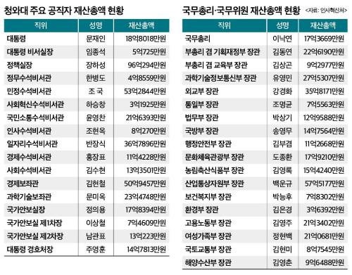 지난해 11월 임명돼 재산신고 명단에서 빠진 홍종학 중소벤처기업부 장관을 제외하고 문재인정부 국무총리와 장관 17명 등 국무위원 18명의 평균재산은 17억9380만원으로 집계됐다. 이낙연 총리는 전년보다 2억1000만원 늘어난 17억3000만원의 재산을 신고했다. 이 총리가 보유한 서울 서초구 잠원동 동아아파트 공시가격이 6억7200만원에서 1억원 올랐으며, 같은 기간 서울 종로구 평창동에 보유한 대지 등 토지 공시지가가 3000만원 상승했다. 예금도 7000만원 늘었다.
