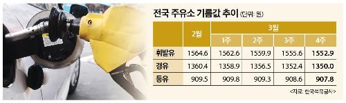 한국석유공사의 유가정보서비스인 오피넷에 따르면, 지난달 31일 기준 3월 넷째주 전국 주유소의 휘발유 평균 판매가격은 리터(ℓ)당 1552.9원을 기록, 전주보다 2.7원 떨어졌다. 경유는 2.4원 하락한 리터당 1350원, 등유는 0.8원 내린 907.8원이다. 주유소 휘발유값은 2월 둘째주 이후 6주째 연달아 내렸다. 앞서 휘발류 가격은 지난해 7월부터 올해 2월까지 30주 연속 상승한 바 있지만 최근 하락세다.