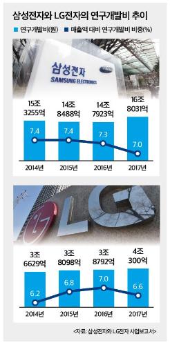 3일 삼성전자와 LG전자의 사업보고서에 따르면, 삼성전자는 지난해 연구개발비로 16조8031억원을 집행했다. 역대 최대 금액이다. 지난 2014년 15조3255억원을 기록한 이후 2015년 14조8488억원, 2016년 14조7923억원으로 2년 연속 뒷걸음질 치던 연구개발 투자규모를 13%나 끌어올렸다. 매출액 대비 연구개발비 비중은 7%였으며, 2016년 7.3%보다는 소폭 줄었다.