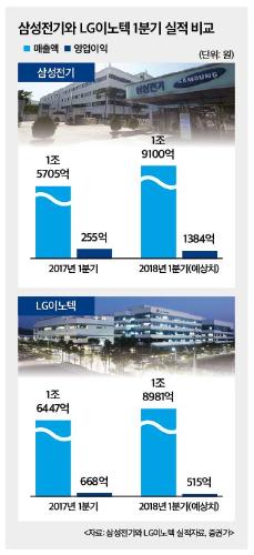 [뉴스토마토 왕해나 기자] 1분기 삼성전기와 LG이노텍의 희비가 엇갈릴 전망이다. LG이노텍은 지나친 애플 의존도에 발목을 잡혔다. 반면 삼성전기는 갤럭시S9가 양호한 판매를 이어가고 있고, 북미·중국 등으로 공급처를 다변화한 덕에 좋은 성적을 이어갈 수 있게 됐다.