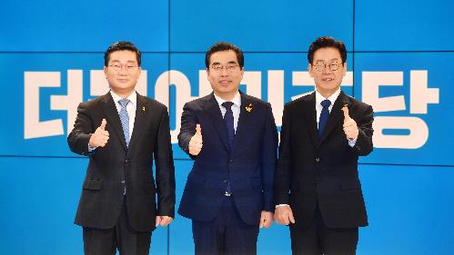 더불어민주당 경기도지사 후보자 경선 TV토론회가 진행된 17일 서울 sbs 목동스튜디오에서 후보자들이 기념촬영을 하고 있다. 왼쪽부터 전해철 의원, 양기대 전 광명시장, 이재명 전 성남시장. 사진/뉴시스