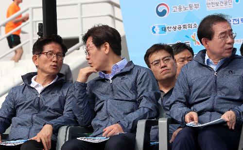 1일 서울 잠실종합운동장에서 열린 '한국노총 2018 노동절 마라톤대회'에서 자유한국당 김문수(왼쪽) 서울시장 후보와 더불어민주당 이재명 경기도지사 후보가 이야기를 나누고 있다. 사진/뉴시스