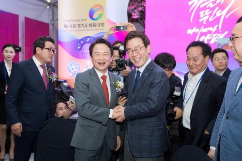 5월26일 경기도 양평군에서 열린 '제64회 경기도 체육대회 리셉션'에서 이재명 더불어민주당 경기도지사 예비후보와 남경필 자유한국당 경기도지사 예비후보(당시 경기도지사)가 인사하고 있다. 사진/뉴스토마토