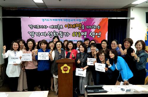 5월10일 경기지역 여성활동가 613명이며 경기도 수원시 경기도의회에서 이재명 더불어민주당 경기도지사 예비후보에 대한 지지를 선언했다. 사진/이재명캠프